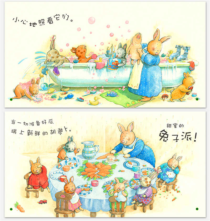 本书为引进的英国绘本。这是一个很温馨的童话故事。给兔宝宝准备一份早餐——兔子派,不只是准备六根大胡萝卜那么简单。图书用精美的图画,表达了兔妈妈在前一天晚上,为六个兔宝宝所做的一切,体现很平常但很温暖的母爱。孩子看后觉得很幸福,很温暖。