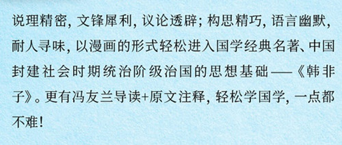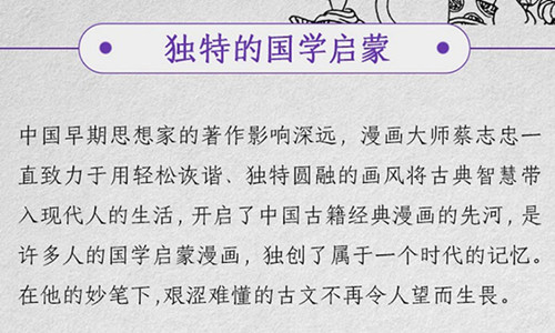 漫画大师蔡志忠所创作的中国古籍经典漫画是许多人的国学启蒙漫画,颇具影响力,开起了中国古籍经典漫画的先河,是属于一个时代的记忆。《韩非子说·法家的峻言》系蔡志忠以古籍《韩非子》为基础创作的漫画,在他的妙笔之下,艰涩难懂的古文不再令人望而生畏。他以简洁清晰的画面、浅显易懂的白话、风趣幽默的故事,深入浅出地解读了古人思想,超越语言与文字的隔阂,替这些重要经典做了适切的诠释。与此同时,他本人旷达、超脱的人生哲学、对经典独到的见解也融会其中,展现出他充满智慧的心灵世界。