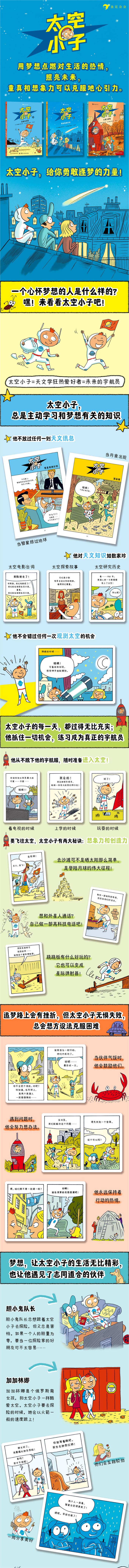 什么,你说在沙滩上看到一个穿着宇航服的男孩很奇怪?那是因为你不认识太空小子!太空小子酷爱天文学,他一听到和星星、太阳有关的东西,就开心得要爆炸!为了做好随时进入太空的准备,他从不脱下他的宇航服。 太空小子用行动证明:地心引力不能束缚童真和想象力!这套漫画记录了太空小子和他的伙伴们幻想中的“太空冒险”,登陆月球、火星营救、发射宇宙飞船……每一次都妙趣横生,充满欢乐。快放松放松你的大脑,跟着乐观勇敢的太空小子一起开启冒险旅程吧!