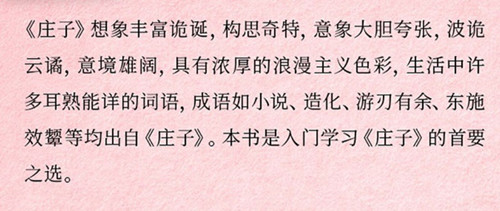 ★《庄子》——国学经典名著,它自觉地把超凡脱俗的思想寄托于寓言中呈现,先秦诸子散文中成就突出的作品。 ★想象丰富诡诞,构思奇特,意象大胆夸张,波诡云谲,意境雄阔,具有浓厚的浪漫主义色彩 ★生活中许多耳熟能详的词语,成语均出自《庄子》:“逍遥”、“浑沌”、“造化”、“志怪”、“小说”、“寓言”、“运斤成风”、“游刃有余”、“邯郸学步”、“东施效颦”、“大有径庭”、“朝三暮四”、“望洋兴叹”、“吐故纳新”、“薪尽火传”、“呆若木鸡”等等