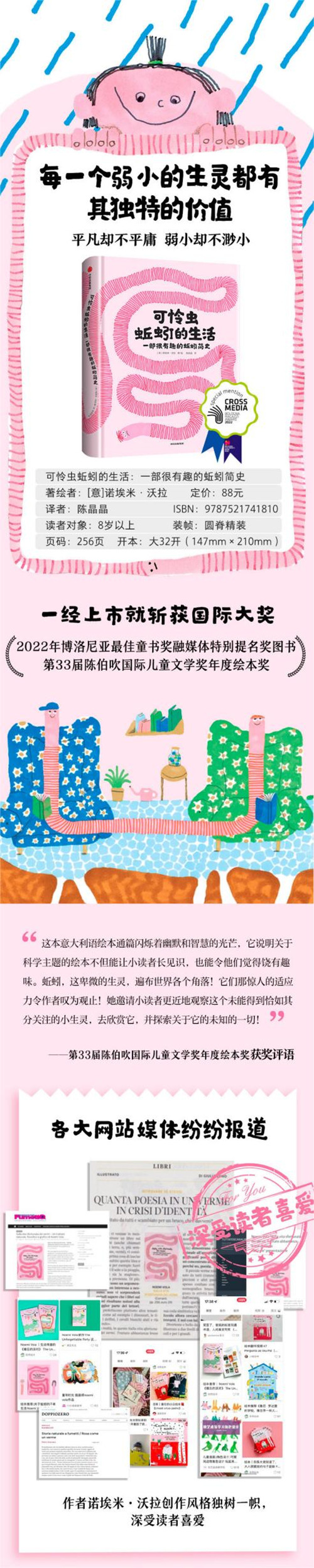 1. 这本书引进自意大利,图书一经上市就获得陈伯吹国际儿童文学奖年度绘本奖,非常具有潜力。 2. 这是一本充满哲思的绘本。作者试图用可怜虫蚯蚓比喻平凡人的一生,这本书让我们震撼的,恰恰是蚯蚓这种微小但却足以移山动地的力量。希望绘本中的蚯蚓可以给读者带来向阳而生的力量,坚定自己,做自己喜欢的事情并且始终保持热爱。 3. 绘本具有具有较高的艺术价值。意大利作家和插画家诺埃米·沃拉在对蚯蚓观察了4年时间的基础上,创作了这本风格独特的书,在书中,她用简单的马克笔创作了200余个别出心裁的蚯蚓形象,为读者勾勒出了可爱、萌趣、温暖、充满勇气和希望的蚯蚓世界。 4. 另类解读蚯蚓世界的轻科普小书。绘本是作者基于科学观察创作的,诺埃米·沃拉长时间观察记录了蚯蚓们的各种生活习性以及面临危险的反应,绘本是在此基础上发挥一定想象创作的。
