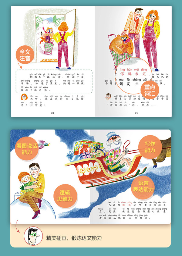 套系简介: 对于学前儿童来说,从听故事到讲故事,从亲子阅读到独立阅读,需要经过一定的过渡。注音版故事书便是提供这种过渡的桥梁。《你读我读桥梁书 想象无限大》共10册,本系列所选取的故事充满想象,包括飞起来的泡泡、魔法森林和魔法铅笔,会说话的游泳圈、恐龙朋友等,每一个都是孩子感兴趣的话题,都能勾起孩子对生活的无限遐想。书中简短的语言,非常适合学龄前儿童进行阅读启蒙。同时,每册书还特别策划了“词汇加油站”,特意标注疑难词汇释义,帮助小读者减少阅读障碍,完成词汇积累,增加阅读收获。 分册简介: 1.《泡泡大冒险》 ——解决问题:遇到问题不慌忙。 今天,巴西尔和爸爸负责洗碗,巴西尔朝洗碗池里倒了许多洗洁精,洗碗池里顿时起了好多泡泡。泡泡越变越大,突然,一个泡泡托起了盘子;另一个泡泡托起了金鱼缸;还有一个泡泡,居然托起巴西尔的爸爸飞走了!为了救爸爸,巴西尔...