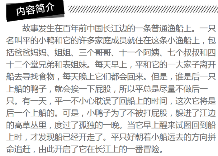 本书为儿童绘本。平是一只喜欢冒险的小鸭子,生活在扬子江上一条画有智慧之眼的船上。他喜欢船上的生活,非常爱他的大家庭,也很喜欢善良的船主人。但他不喜欢每天最后一个回家,因为最后回到船上的小鸭子总会被打一下屁股。但是有一天傍晚,平因为贪玩落在了最后,他该怎么办呢?只为了躲过屁股上挨一下,平那天选择了不回家,迎来一段在扬子江上的冒险经历……