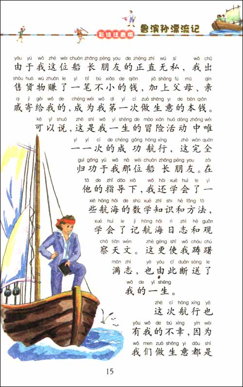 想象一下,假如你一个人流落孤岛,你会想些什么?会做些什么?会遇到些什么呢?我们富有冒险精神的主人公鲁滨孙便有着这样不同寻常的经历。他在一次出海时遭遇海难,独自一人被困于孤岛,但他并没有被恶劣的环境击败,而是凭着自己的机智以及勇敢、乐观的精神,顽强地在孤岛上生活了二十八年。