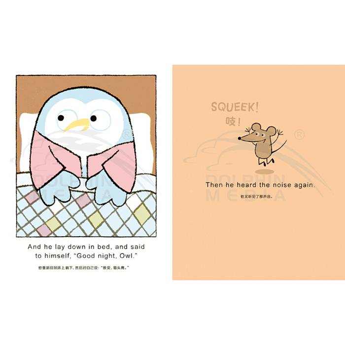 猫头鹰准备睡觉了,他对自己说:“晚安,猫头鹰(good night,owl)!”但每次他刚刚闭上眼睛,就听到房间里奇怪的叫声:squeek!猫头鹰睁开眼睛,在房间里找那个声音的来源。猫头鹰把橱柜、书架、地板统统都翻了个遍,他能找出那个奇怪的声音,然后安心睡觉吗?……猫头鹰将永远不会睡觉,除非他能搞清楚这是怎么回事!也许,一句温柔的由此及彼的“晚安”是让大家都能享受安稳夜晚的魔法……