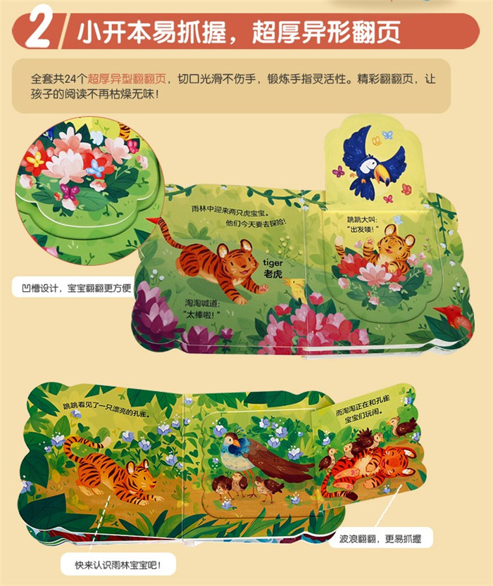 这是一套为低幼宝宝设计的故事翻翻书,共四册,呈现了雨林场景下的故事。选取两只动物宝宝作为主角,跟随它们去玩耍探索,不断发现新的朋友,然后和他们打招呼逗乐。本套书采用新颖独特的异形翻翻设计和一问一答的互动形式,并配合可爱稚趣的插图来帮助孩子读故事,使得宝宝故事体验更有趣。每册书有六个跨页,翻口位置呈波浪式,外观精致,而且超厚纸板撕不烂,精致小巧易抓握。宝宝每翻开一张翻页,都可以发现惊喜,同时也能促进宝宝小手精细动作的发展。除此之外,书中采用中英双语对照的形式,从婴儿时期激发宝宝的语言能力,让宝宝能够全面发展。这套书是低幼宝宝启蒙教育的不二首选。