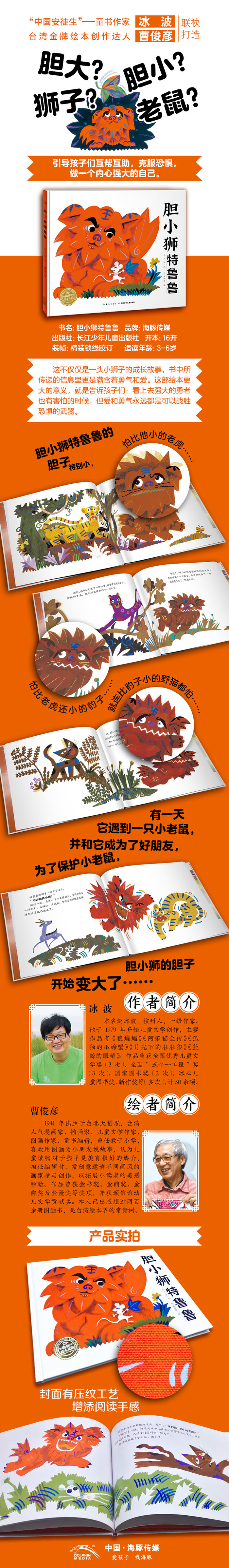 《胆小狮特鲁鲁》是一本针对3-6岁孩子的绘本。一本让孩子学会勇敢、正确面对自己的绘本。充满想象力、夸张诙谐的情节和一波三折的结构引人入胜。特鲁鲁狮子长得高大、强壮,看起来很威武。可是,谁也不知道,特鲁鲁狮子有一个怪毛病,那就是,它的胆子非常非常小。头上落下一片树叶,特鲁鲁狮子也会抱着脑袋,吓得发抖。有一次,它遇见一只老虎。老虎朝它看了一眼,它吓得拼命逃。逃啊,逃啊,特鲁鲁狮子的身体越变越小,变得像豹子一样大了。接着,它又遇到了一只豹子,豹子看了它一眼,它又吓得转身就逃。逃啊,逃啊,它又变小了,变得像野猫一样大了。最后,像老鼠一样小的特鲁鲁狮子遇见了一只小白鼠,它们互相看了一眼,都吓坏了。糊里糊涂的,它们两个都朝一个方向跑。最后才发现,原来对方其实一点也不可怕。