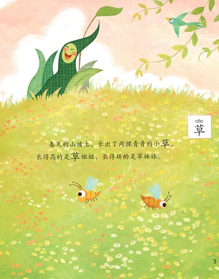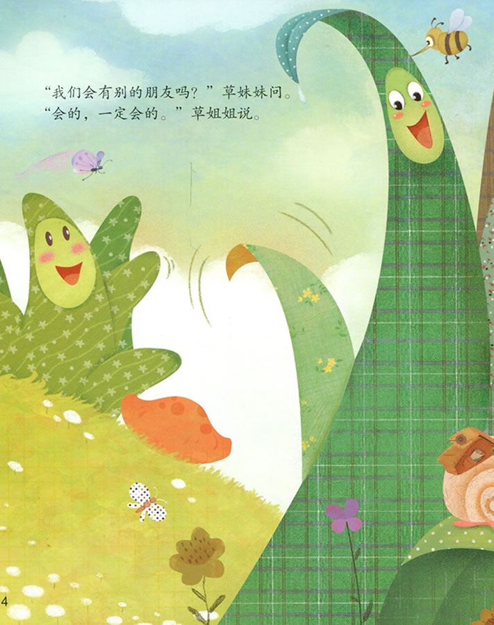 春天的山坡上长出了一对草姐妹,然后,在一天清晨,她们结识了戴着圆圆的帽子、爱害羞的小蘑菇,高高挂在天上、圆脸蛋的大太阳,以及一群喜欢四处飞舞的花蝴蝶——她们一起在阳光下欢快地跳舞。春天里的朋友,真快乐!