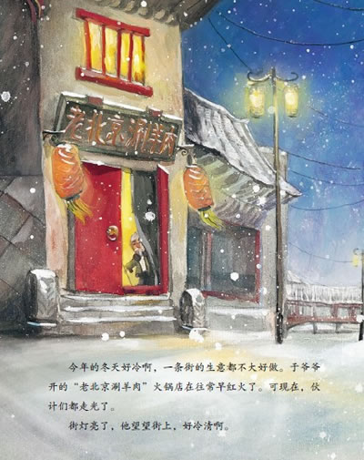 “进来吧——热乎乎的火锅子点着了”于爷爷的召唤,让胡同里饥寒交迫的三个孩子,品尝到了涮羊肉。三个孩子渐渐成为老爷爷的助手,他们打点着铺子,把生意做的热乎又兴隆,然后就离去了。于爷爷心里惦记着他们,他们还会回来找爷爷吗?
