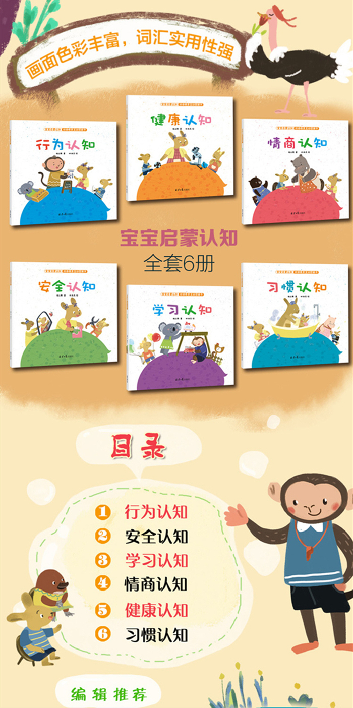 《 安全认知》对于宝宝来说,提高自我保护意识和面对危险时的基本应对能力是很重要的。为此,这本书列举了在宝宝的日常生活中常见的、极易发生的危险及应对的办法。重点词汇在相应的画面中双语标出,让宝宝轻松记忆。