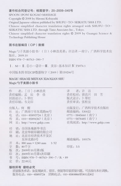 日本、韩国*话题性、美容达人争相推荐的美容方法,真实见证,年近50的日本美容界教母小林浩美与勺子创造的不老奇迹! MSN、新浪、腾讯、搜狐、凤凰网、瑞丽女性网、太平洋女性网热议的神奇美颜术 日本著名演员国生小百合、最受欢迎的主持人中井美惠联袂推荐! 大S、伊能静等明星都用过书中推荐的美容方法!4大权威电视台NHK电视台、朝日电视、日本电视台、东京电视台一致热议好评! 众多权威媒体《FYTTE》、《MAQUIA》、《marisol》、《REAL SIMPLE》、《Tarzan》、《anan》争相报道。 勺子按摩3天改善肤质;3周肌肤年龄回到20岁。
