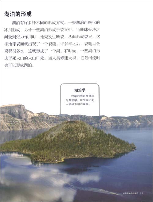 《我们爱地球·世界最神奇的湖泊》内容简介:世界上的湖泊有许多种,有些湖泊是由融化的冰川形成的,还有些湖泊是由休眠的火山口积水形成的。让我们一起探索这些神奇的湖泊,共同了解这些湖泊里的动物和植物,以及生活在湖边和湖中岛、屿上的人们。哪个湖泊中漂浮着70个小岛?研究湖泊的科学家被称为什么?哪个湖泊可能会在20年内变成沙漠?