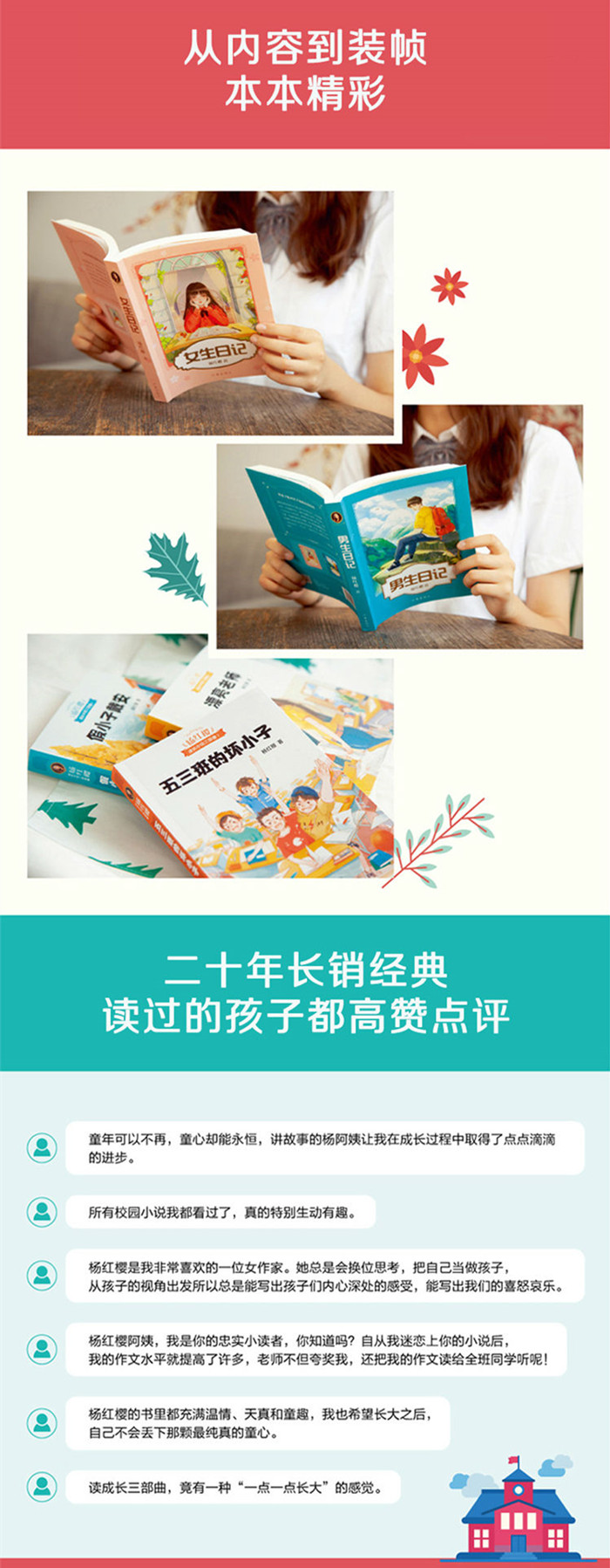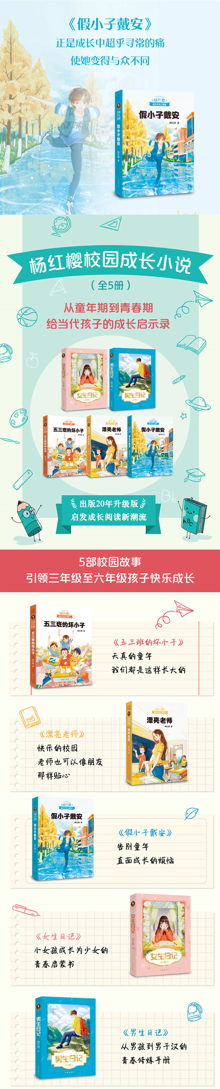 "杨红樱校园成长小说系列"是关于全中国每个孩子的校园故事,能引领老师、家长和孩子换位思考,搭建三者的沟通桥梁。读完《五三班的坏小子》《漂亮老师》和《假小子戴安》,老师和家长能更理解和认同孩子,孩子会获得更多成长指导,更有合作精神。