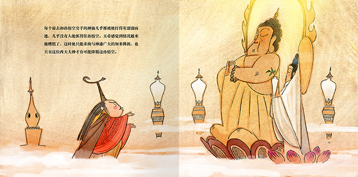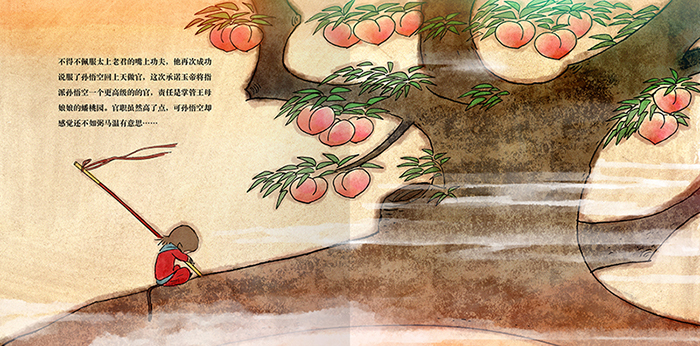 孙悟空向东海龙王借得定海之宝--如意金箍棒,又去地府强销生死簿,自封”齐天大圣”。托塔天王李靖奉命率领天兵天将捉拿孙悟空,却被悟空打败。玉帝在太白金星的建议下,第二次招安孙悟空,封他为有名无实的齐天大圣,并让他去管理蟠桃园。没过多久,王母娘娘开蟠桃大会,让七仙女到蟠桃园摘取仙桃,孙悟空在得知蟠桃会没请自己后,大闹蟠桃会,再次逃回花果山。二郎神率领天兵将孙悟空擒拿,押上天庭。但斩妖台各种刑法都无法伤到孙悟空分毫,反而炼出火眼金睛,四十九天后逃出天宫。后来,如来佛用五指山才镇压了孙悟空。