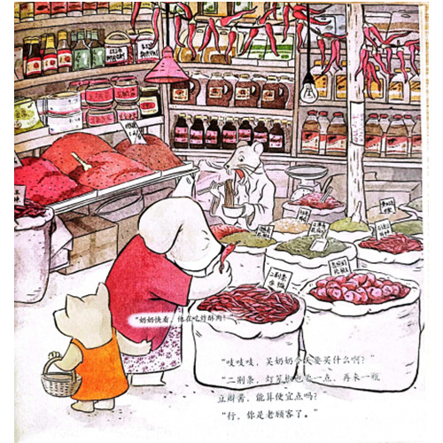 热热闹闹的中国传统市场,各种各样好吃的和好玩的,让孩子在烟火气中体会到市井生活的温馨与幸福,感受生活的热气 球球一家人生活在一个小城里。今天球球很开心,因为奶奶带她一起去逛市场了!市场上有太多球球喜欢的东西了:供应各种小吃的早点摊子、小金鱼、亮晶晶的小首饰、熙熙攘攘的人群、此起彼伏的叫卖……还有各种奇奇怪怪的摊位,卖膏药的、剃头的、修水管的……如今,小城的朴实、热闹、简单都离我们的生活越来越远,这本书让已经习惯超市商场的城市生活的我们回到平凡但温馨的生活场景,感受生活的质地与生命的蓬勃。 一本让孩子津津有味读完的绘本,交织着孩子和祖父母在一起的幸福。中国式祖孙情解锁中国人的情感密码,为孩子创造美好的点滴,让孩子感受亲情和童年的美好时刻 奶奶看着自己的采购名单,一会儿停在卖蔬菜的摊子面前,一会儿又跟调料铺的耗子老板聊天砍价,一会儿又去买爷爷*喜欢吃的苦瓜,但是球球满脑子都是炸酥肉!奶奶承诺周末给球球做炸酥肉,但是她球球就想今天吃……等到奶奶准备去买带鱼的时候,球球再也不能等待了,她准备自己去买炸酥肉了!糟了,买炸酥肉需要钱,但是她没有。球球站在炸酥肉的摊子前面,着急得都快要哭出来了,这时候她背后响起一个熟悉的声音“球球,你怎么一个人,你奶奶呢”…… 全景式再现小城生活,让孩子亲近爸爸妈妈的童年,消融80/90后父母与10后孩子之间的代际隔阂,增加代际认同感,相互理解和包容 市场是一个社会的缩影。近20年,中国的城市化进程很快,城乡差距逐渐拉大,从小镇到大城市生活的80/90后和自己的孩子,代际认同割裂也在逐步加大。这本书以一种巧妙的方式让孩子体会到小城生活的乐趣,增进和爸爸妈妈的相互理解。 山城重庆的地域特色、特殊的饮食文化,随书随机附赠炸酥肉食谱,亲自动手品尝炸酥肉之味 在这个故事里,居民楼依地势而建,沿着重庆崎岖不平的“山路”,居民们上上下下。奶奶的采购单子里有毛肚、鸭肠、笋子、豆腐果、二荆条、灯笼椒、豆瓣酱……还有叮叮糖、炸酥肉、小面等特色美食出没……