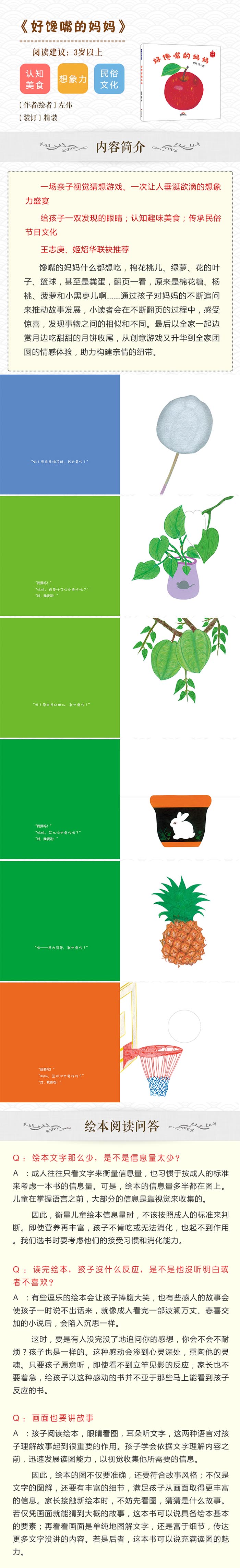 这是一套适合1-5岁孩子阅读的原创创意游戏洞洞书。书中的妈妈什么都想吃,孩子通过对妈妈的追问来推动故事发展,小读者会在翻页的过程中,感受视觉的惊喜,发现事物的相似和不同。该书不仅能培养孩子的认知、观察能力,在最后还从创意游戏又升华到全家团圆的情感体验。