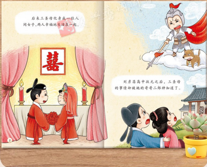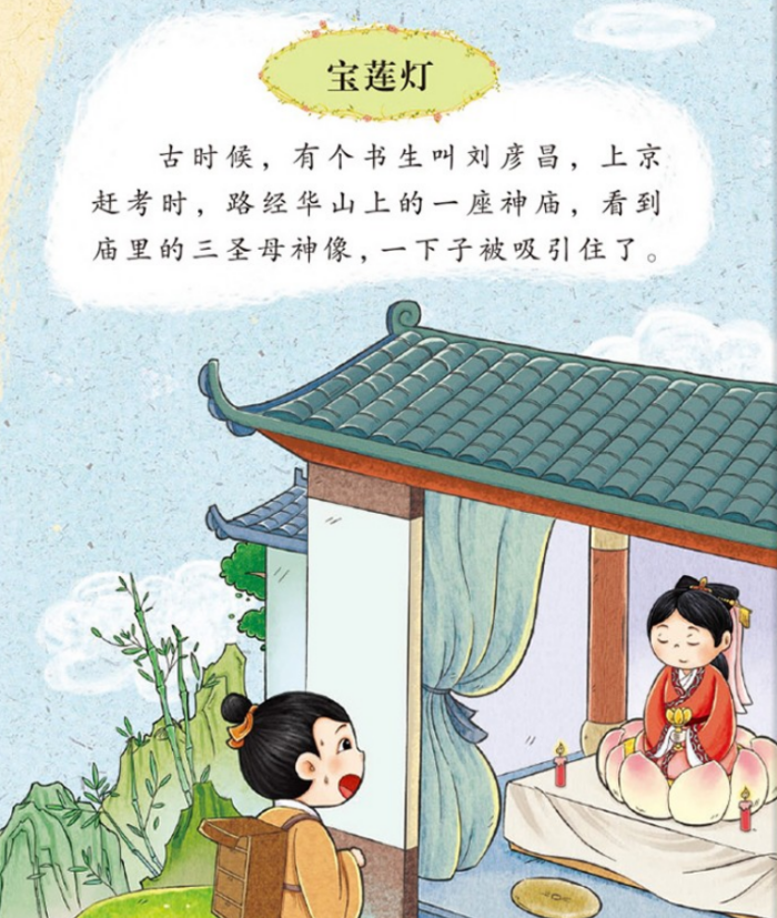 古时候,有个书生叫刘彦昌,上京赶考时,路经华山上的一座神庙,看到庙里的三圣母神像,一下子被吸引住了。