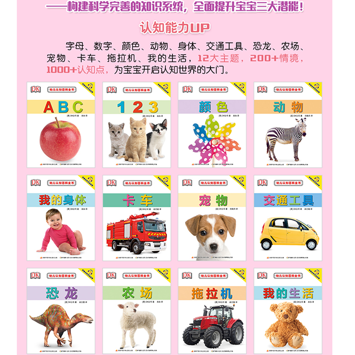本系列认知书共12册,内容不仅涵盖常见的认知系列,数字、字母、颜色、身体、动物、交通工具等,还包括生活环境、拖拉机、卡车、恐龙、宠物等新领域。全系列采用英国DK公司高清原版图片,并配有精确、科学的译文。本套图书中英双语,附赠免费音频。内容方面分为12个主题,约有200个情境,1000多个认知点。全套采用情境认知的方式,由整体到局部,方便宝宝更好地融入其中。