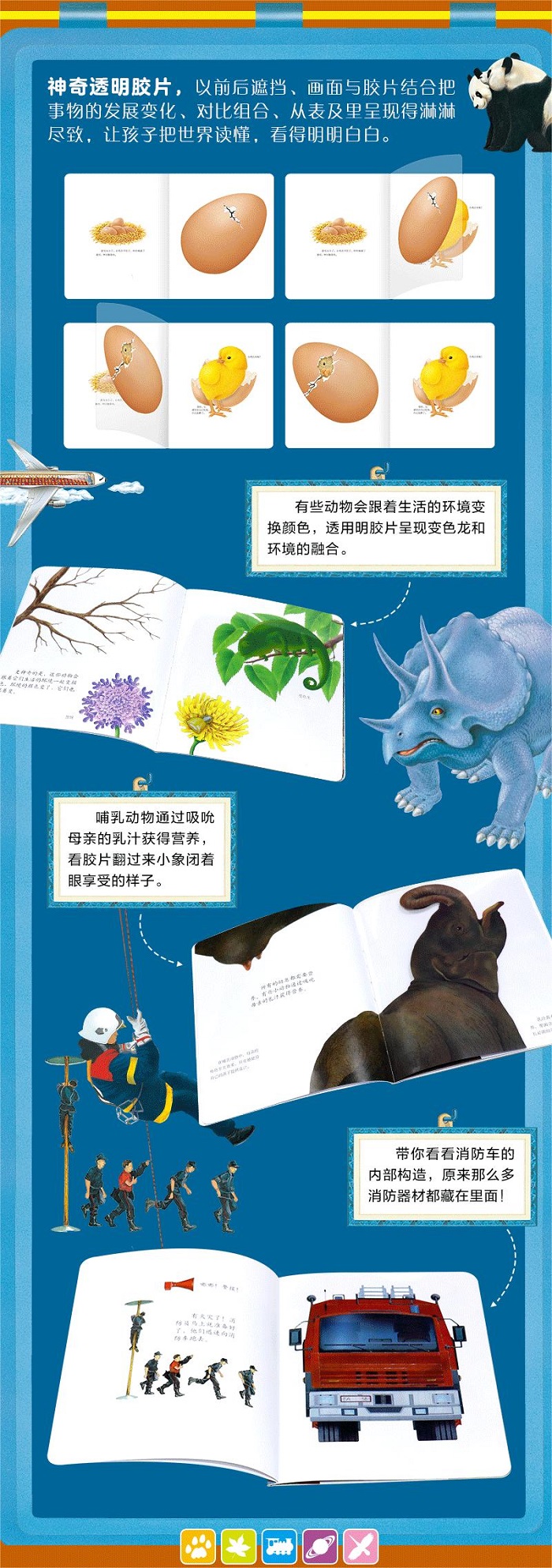 本套书是一套畅销世界的最具启发性、创意性的国际级儿童科普丛书,得到全球媒体的一致推荐。这套图书的奥秘,在于它利用大量精致的彩色绘图,第一眼就激起孩子的浓厚兴趣。最特别的是,在书中加入光滑透明的材料,将传统书籍的平面空间发展成为可以透视的多维空间,大大增添的图书的趣味性的同时,也降低了探索书中奥秘的难度,成为各国小朋友进入科学世界的最佳伙伴。