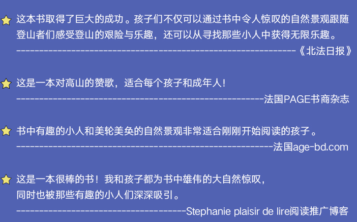 整本书充满了壮观的自然景观,人们像蚂蚁一样穿梭其间,他们背着行囊、前进、嬉戏、观察、寻找着前进的方向。最后,人们登上,看到满天星光。直到最后,我们才发现,原来那个叙述者是索绪尔身边的那只小狗——他*忠诚的朋友。