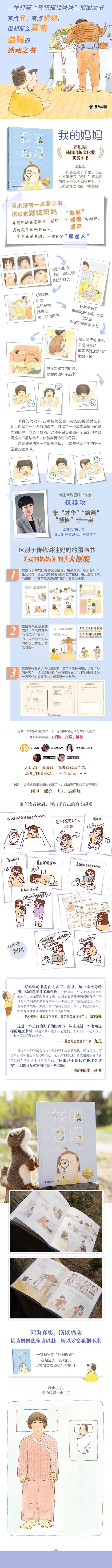 当我眼看见妈妈的时候,她的脸竟然又丑又肿; 当妈妈给我喂奶的时候,粗心的她却把奶瓶怼在了我的脖子上; 当妈妈俯身抱我的时候,她的身体总是发出咯吱咯吱奇怪的响声; 当妈妈的妈妈来到我家的时候,她却躺在沙发上呼呼大睡。 《我的妈妈》,一本从宝宝视角探究新生妈妈一年生活的生动图鉴,用近乎严酷、夸张的方式,打破传统,创新性地描绘了一位窘态、狼狈,却又现实的妈妈形象,以丑写美,以惰写勤,讴歌了母亲的伟大、辛苦与不易。 这是给孩子的堂母爱之课,也是献给所有在陌生的新世界里孤军/艰苦奋战的妈妈们的心灵抚慰。
