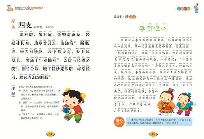 为了让孩子们领略到我国传统文化的博大精深,帮助孩子们开阔思路、培养品格,我们精心编撰了本书。在编写过程中,我们力求做到知识准确,从 入则孝、出则悌、谨、信、泛爱众、亲仁、学文等几个方面,依次讲解了如何对待父母兄弟、如何为人处世、如何读书学习和修养品德的礼仪与规范。为了帮助孩子 们更好地理解原文,我们还提供了准确的注释和简洁明了的译文。为了提高孩 子们的阅读兴趣,使孩子们能以一种轻松的方式进行阅读,我们还精选了许多与原文主题思想密切相关的生动小故事。此外,我们垣j晕買了二受全解读”栏目,点 出原文及故事中所蕴涵的道理,帮助孩子们加深理解。我们还为本书选配了大量精美生动的彩色插图,可以让孩子们在阅读过程中加 深对故事的理解,充分体会到阅读的乐趣。 《幼学琼林》是我国古代影响*的儿童蒙学读本之一。全书全部用对偶句写成,文字精练,对仗工整,便于诵读。它内容精深,涉及天文、地理、历史人物、典章制度等,无所不有,堪称名副其实的蒙学“大全”。