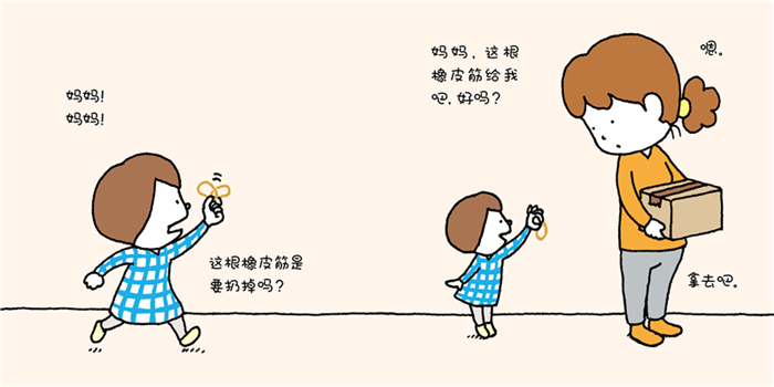 我在家里的垃圾桶里发现了一个橡皮筋,妈妈说可以把它送给我。太好了!这就是我的橡皮筋了,只属于我的橡皮筋。既不是哥哥用剩下的,也不需要和其他人分享,也不是从别人那借过来的,它是任何人用任何东西都不能换走的我的宝贝。我要和橡皮筋形影不离,还要用它做很多事,到任何想去的地方。