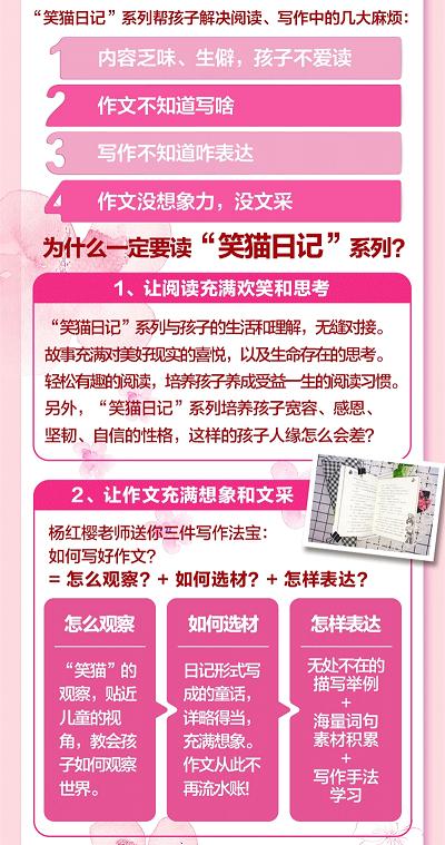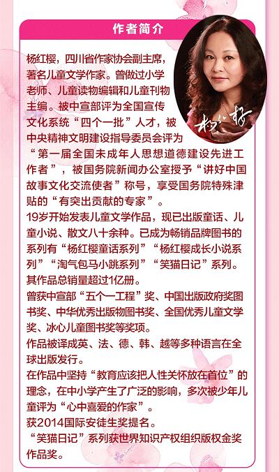 《笑猫日记》系列是中国当代著名童书作家杨红樱女士的最新代表作,销售码洋超过1300万册。这是以中国孩子的现实生活为背景的系列童话故事,它以一只会笑的猫为故事的讲述者,用日记体的写作形式,创造了动物与孩子共同参与、幻想与现实相结合的多层次的文学世界。孩子们既可以享受儿童文学的天真和趣味,也可以领略蕴藏在字里行间中的人生智慧和生活哲学,从而培养其坚韧、宽容、感恩、自信等品质,始终怀着一份对社会、对未来的美好情感和信念健康快乐地成长。