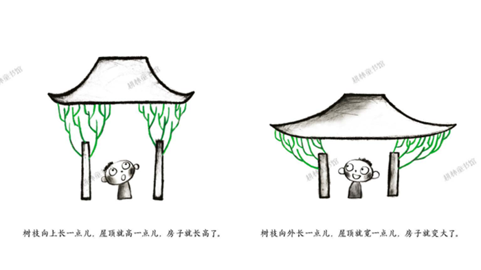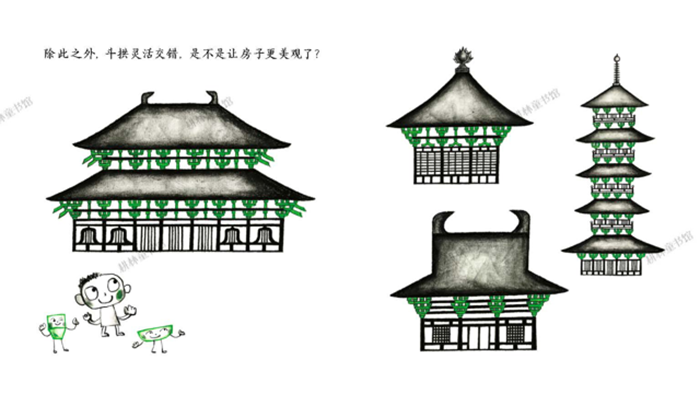 我在长高,树也在长高,房子会长高吗?是的,房子也会长高。我们智慧的祖先为房子设计了两种拥有树枝一样功能的构件:斗和拱。它们使我们的房子变成了搭积木的高手:一斗三升,加上一条枋,再加上一条昂,积木越搭越复杂,房子也越长越高大。斗拱传递出了房子的美和气概。房子长大了,我们的精气神也长大了。