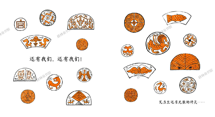 房子的屋顶上铺着上下起伏的瓦片,从前面看它们就像一条流淌的河,而在瓦片前端的瓦当就像一条条小船,静悄悄地待在那里。但到了晚上,这条“河”上一下子热闹了起来,原来在“小船”里住着各种各样的“精灵”,到晚上,它们就都会跑出讲各自的故事;这些“精灵”包括:背太阳的三足乌、贪吃的饕餮、镇守四方的四大神兽、优雅的羽人、长着大花脸的紫金山神……小“河”流淌流淌,故事流淌流淌,不断有新的“精灵”住进“小船”里,为我们讲着来自屋子里住着的人的故事。
