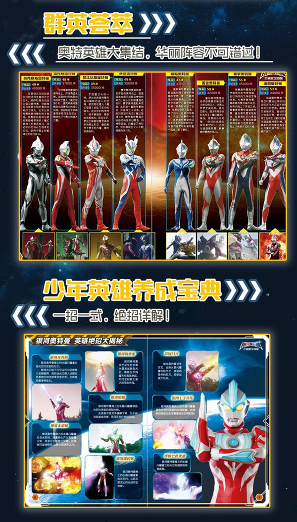 这本图鉴书一大鲜明的特点就是浓缩、全。在一本书里浓缩了三部以银河奥特曼为主角的影视作品,精华内容全收录。一本书就能让孩子喜欢的英雄、怪兽全都陪在身边,英雄勇敢高尚的精神情操、精炼的文字和精美的图画,给孩子经久不息的熏陶。