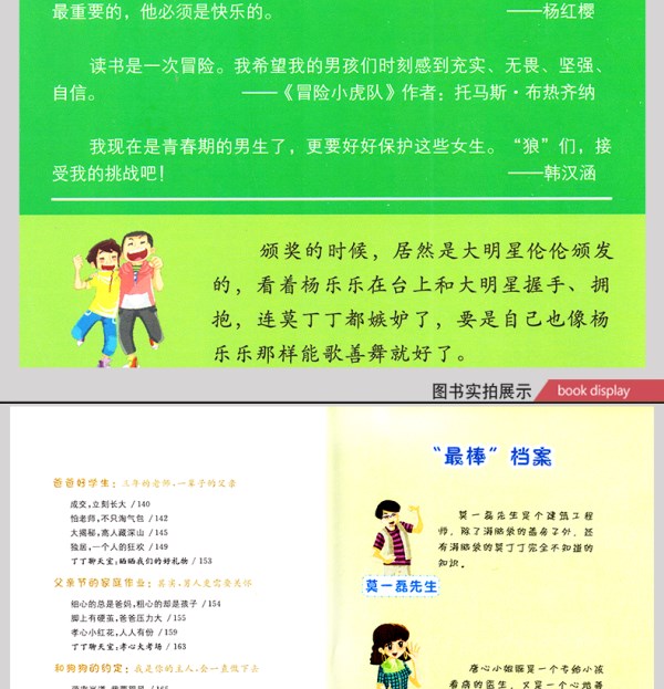 本书是“了不起的男孩”系列图书的一本,主要讲述了小学四年级的学生丁丁在学校和家庭中发生的各种有趣的故事。书中记录了他从一个调皮的小男孩变成一个小男子汉的成长经历,以及他是怎样逐步懂得了照顾妈妈,帮助同学,爱护小动物,感悟到要拥有一颗感恩的心来拥抱每一天的生活。学会爱,分享爱,这样才能成为一个受欢迎的男子汉。