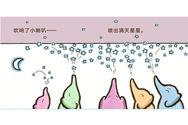 本书是一本关于晚安与概念认知的图画书。主要内容是:“看,大象们来了!”五只颜色各异的大象:一只黄色,一只红色,一只绿色,一只蓝色,还有一个小不点是粉红色。大象们排着队在游行,上山、下山,浮出水面,沉入水底,钻过山洞,然后绕个圈,大象们一直走啊走,这是要去哪里呢?从白天走到黑夜,总算到达了他们的目的地,向着夜空伸长鼻子,喷出满天繁星,是时候和各位道晚安啦!
