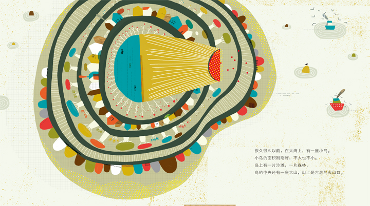 看这一幅《小岛和大桥》的内页,画里有小岛、沙滩、石头、森林、房子、大山、火山口、船、水、鱼儿、海鸥。你知道它们在哪儿,是吗?