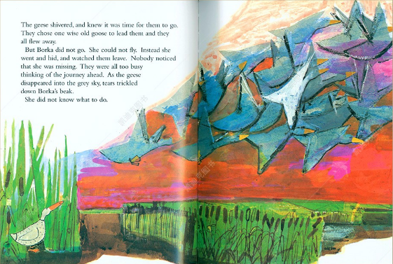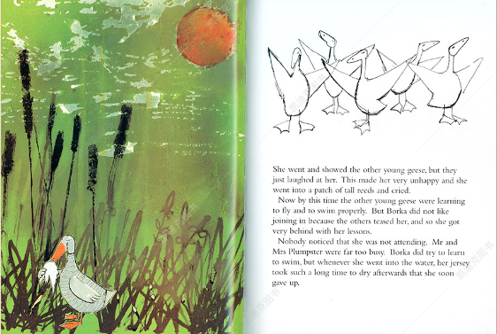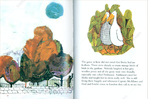 Borka 是一只从出生就没有羽毛的大雁,妈妈为他织了一件灰色毛背心,但这也受到了其他大雁的嘲笑,还耽误了学游泳和飞行的机会。寒冬将至,大雁们飞往南方过冬,Borka 只能留下来。经过一番波折和奇遇,他留在了有各种动物的Royal Batanic Gardens,而没有羽毛的大雁在这并不稀奇。从此Borka过上了快乐的生活。