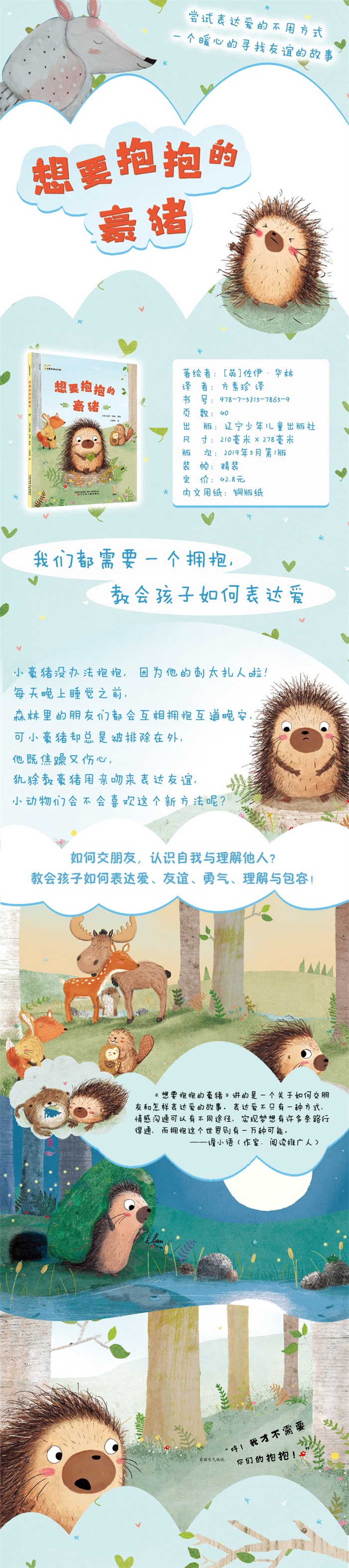 《想要抱抱的豪猪》讲的是一个关于如何交朋友和怎样表达爱的故事。表达爱不只有一种方式,情感沟通可以有不同途径,实现梦想有许多条路行得通,而拥抱这个世界则有一万种可能。 ——谵小语(作家、阅读推广人)