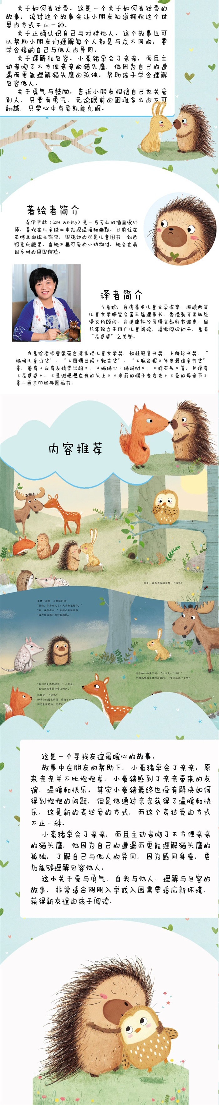 森林里的小豪猪没有办法和其他的动物拥抱,因为他的刺太扎人啦!每天晚上睡觉之前,所有的森林朋友们都会互相拥抱,并且说一声晚安。除了豪猪,总是被排除在外,因此他感到十分焦躁与伤心。犰狳教豪猪用亲吻来表达,这个方法让豪猪觉得很开心,并且迫不及待地要向朋友们展示。但是,森林里的其他朋友们,会不会喜欢豪猪这个新的方式呢? 这是一个寻找友谊*暖心的故事。 故事中在犰狳的帮助下,小豪猪学会了亲亲。原来亲亲并不比抱抱差,小豪猪感到了亲亲带来的友谊、温暖和快乐。其实小豪猪*终也没有解决如何得到抱抱的问题,但是他通过亲亲获得了温暖和快乐,其实他渴望抱抱不就是为了感受温暖和快乐吗?这是新的表达爱的方式,而这个表达爱的方式不止一种。 小豪猪学会了亲亲,而且主动亲吻了不方便亲亲的猫头鹰,他因为自己的遭遇而更能理解猫头鹰的孤独,了解自己与他人的异同,因为感同身受,更加能够理解包容他人。 这本关于爱与勇气、自我与他人、理解与包容的故事,非常适合刚刚入学或入园需要适应新环境、获得新友谊的孩子阅读。