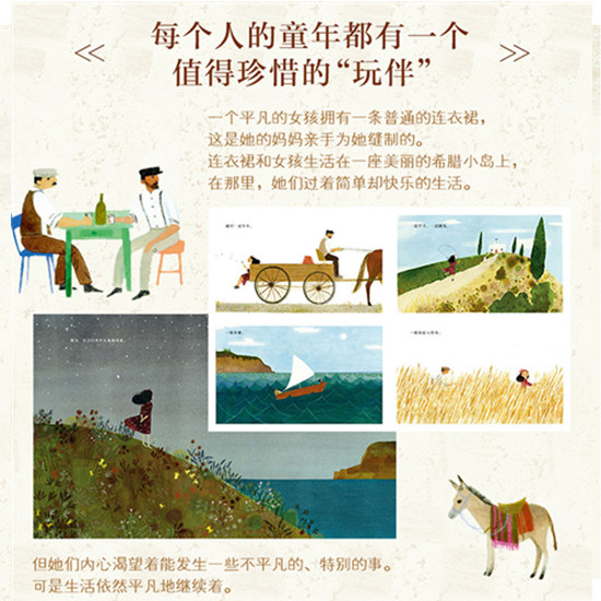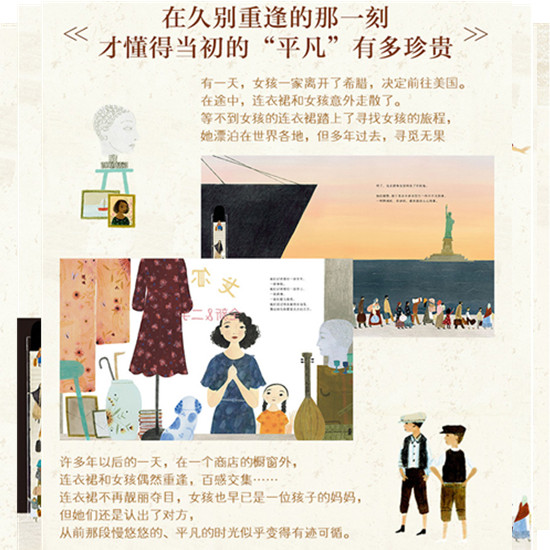 我在细读后,想到故事设置的背景是连衣裙和女孩从希腊搬去美国,又多了一些感慨。当初的女孩现在已经是一个孩子的妈妈了,也许她的女儿从未去过妈妈的家乡,也不曾见过远方的亲人。可当她为女儿穿上这条连衣裙时,似乎就牵起了女儿与那个装载着她美好回忆的家乡的联系。