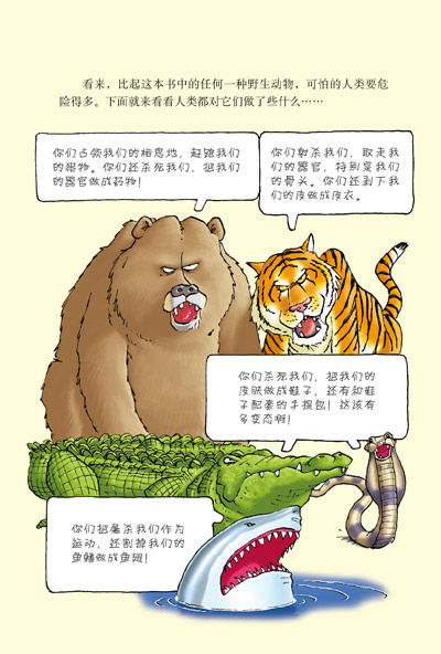 你会跟凶猛的野兽讲道理吗?当一头黑熊冲你伸出舌头,当一头鲨鱼跟你并肩游泳,当一条蟒蛇怪你挡住了它的路,要说些什么才能让他们走开?还有,当你想吓哭一只老虎,当你想给一条鳄鱼拍大头照,要怎样才能让它们配合?哈哈,朋友,这一切都不难,记住,沟通可以解决一切!赶快收拾行李,体验精彩的被野兽袭击之旅吧!