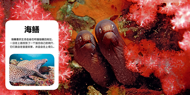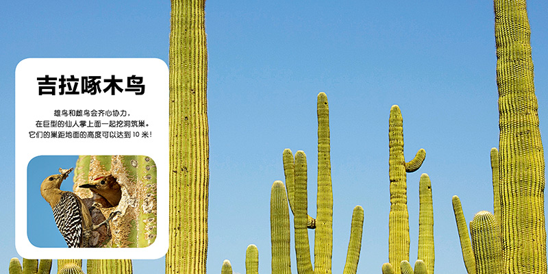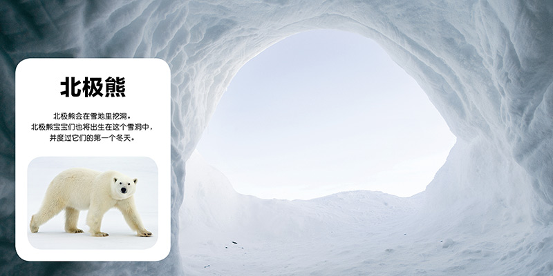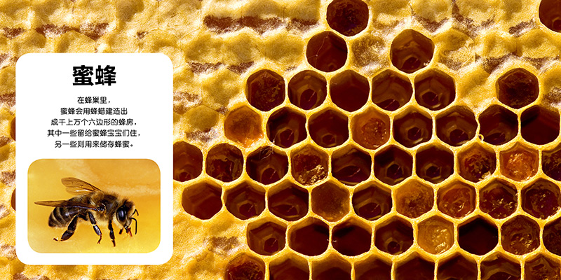 每张跨页上都有一张展示动物和它的居所的大幅照片,一侧的小方框里标出动物的名称、照片和有关它藏身之处的科普信息。小朋友将看到自然界中动物千奇百怪的筑巢、挖洞方式和各种环境下的各式各样的居所。