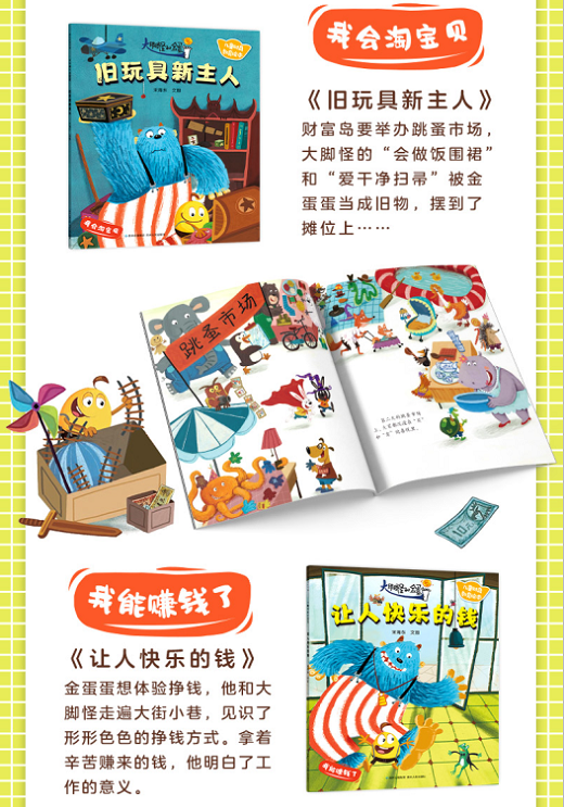 来自没有“钱”的地方的大脚怪,和年龄很小的金蛋蛋,因为不了解等价交换、商品流通的常识,闹出了很多笑话;同时,他们也看到了别人在消费中的一些问题,比如在超市购物的时候,猴子乱抛商品,袋鼠把没付钱的商品放进自己的育儿袋里,孩子们通过阅读,了解了污损商品、未结账就将商品据为己有是不正确的,还懂得了要看清标价、量入为出,在哈哈大笑之后,也会跟大脚怪……