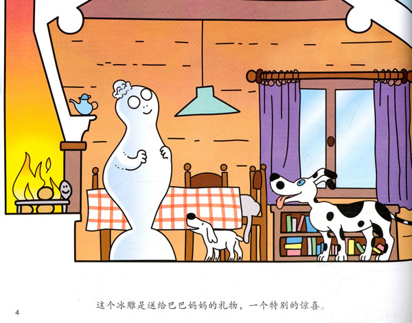《巴巴伯的冰雕不见了》讲述巴巴爸爸一家去山上度假,巴巴伯想给巴巴妈妈做一个冰雕,可是做好的冰雕不见了,究竟是怎么回事儿呢?通过故事给孩子们讲水的不同形态,随着周围温度的变化,水可以变成冰、雪或者冰雹,也可以变成水蒸汽的科学小知识。
