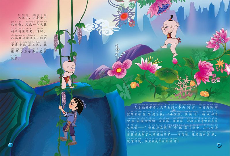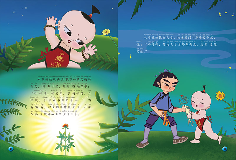 《人参娃娃》长工小虎子常年受到财主胡扒皮的虐待。一天夜里,他在井边挑水时发现了一个身穿红围兜的人参娃娃,便与他成了好朋友。为了帮小虎子还清欠债,人参娃娃送给他一株大人参。财主见了人参,,料想娃娃是个人参精,便要设计抓住人参娃娃。小虎子悄悄去给人参娃娃送信,不料财主在后边偷偷跟踪,抓住了人参娃娃的小辫子。小虎子和人参娃娃齐心协力对付财主,最后不仅脱离了危险,还让财主掉进了自己挖好的洞里。