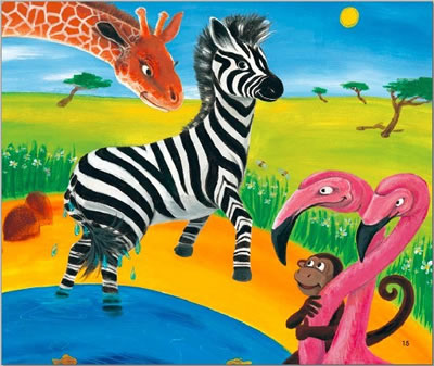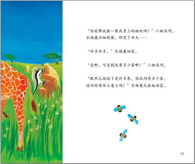 小斑马的身上有多少条斑纹?小斑马自己怎么也数不清。一、二、三、四、五……河马、长颈鹿、狮子、大象、猴子都来数,依然数不清。小斑马只好去问妈妈和爸爸。那么,究竟是谁给出了那个最妙的答案呢?