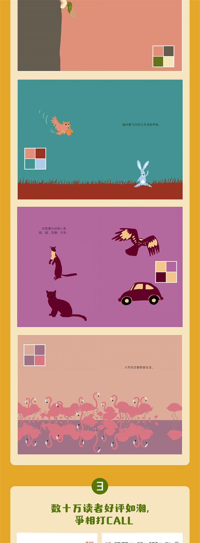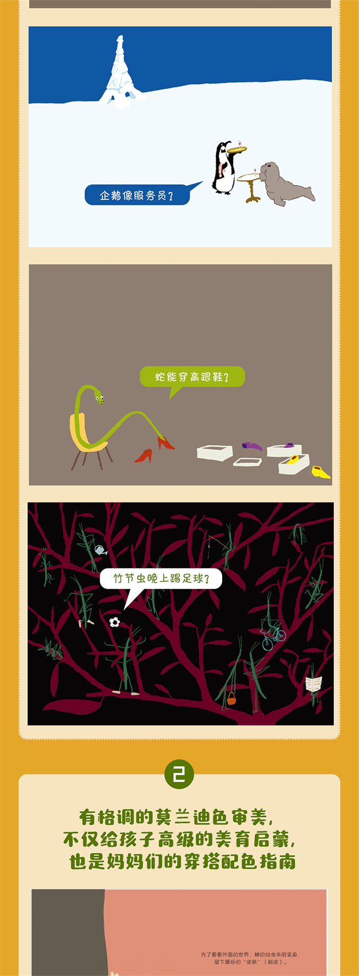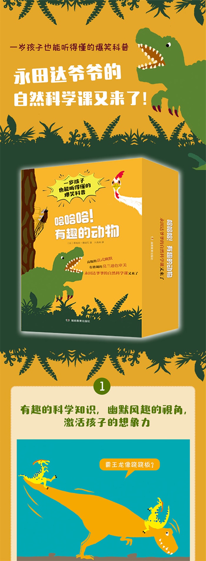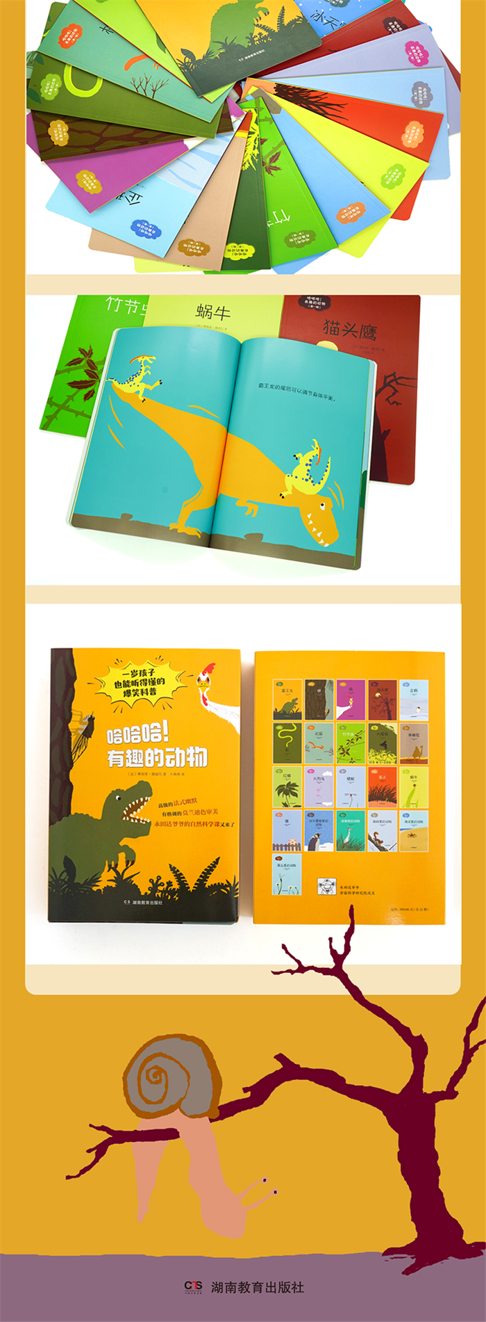 《哈哈哈!有趣的动物》共三辑21本,分别是竹节虫、猫头鹰、蛇、蝉、鸡、企鹅、霸王龙、松鼠,大猩猩、骆驼、火烈鸟、蜻蜓、猪、蜗牛、红蝽、虱子,草丛里的动物、海洋里的动物、森林里的动物、池塘里的动物、冰天雪地里的动物。整套书由永田达爷爷带着孩子们一起观察,用严谨的科学态度、幽默的语言,向孩子们科普了这些动物的外形特点、生活习性、成长规律等,还有很多动物们的小怪癖。整套绘本风格温馨,色彩明亮,有故事的画面,简洁风趣的文字,藏着法式的小幽默,是一套一岁孩子也能读的自然科普绘本,能够帮助孩子认识、走近人类的动物朋友,了解有趣的科学知识,亲近大自然。