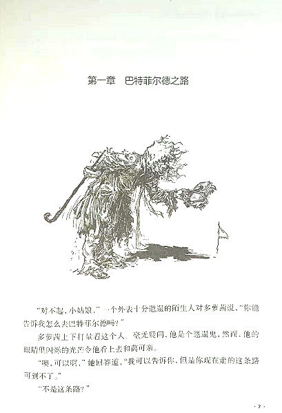 “噢,可以啊,”她回答道,“我可以告诉你,但是你现在走的这条路可到不了。”“不是这条路?”“首先,你得穿过这块十英亩①的农田,然后沿着小路走上一条公路,再向北走,直到你看到一个可以通往五个不同去处的岔路口,接着……让我想想……”“哎呀,小姑娘,如果可以的话,你说得越详细越好啊。”邋遢鬼说。