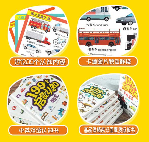 199个启蒙认知》是专门为2-6岁幼儿打造的双语启蒙认知书。本套书共6本,共6个认知主题,每本书包含199个认知内容,选取的内容都是宝宝感兴趣或者熟悉的事物,能激发宝宝认读的兴趣,达到认知的目的,是适合宝宝的双语启蒙认知书。全书采用卡通图片 双语词组 生僻字注音的认知形式。将199个认知内容分类进行图文展示,充分刺激宝宝视觉神经的发展,激发宝宝认读的兴趣。同时,本套书充分考虑读者的阅读需求,为了给读者提供更好的阅读体验,将生僻字注音,方便家长帮助宝宝认知,能够很好地启发宝宝智力,增强宝宝认知能力。本套书是内容丰富、分类明确、大小适中的双语认知书,能够极大地满足幼儿认知训练的需求。