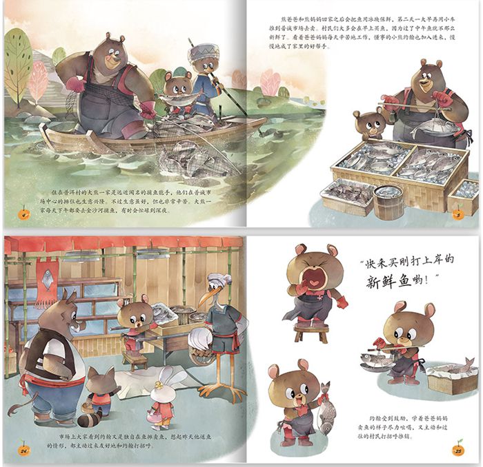 小熊一家在普诚市场中有一个卖鱼的摊位,熊爸熊妈每天捕鱼后都要赶在第二天一早拿去市场里出售。