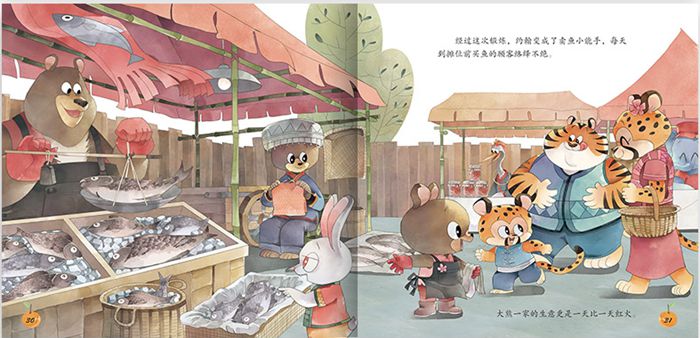 面对鱼卖不出去就会变质的后果,小熊鼓起勇气,把鱼全部送给了市场里的顾客。