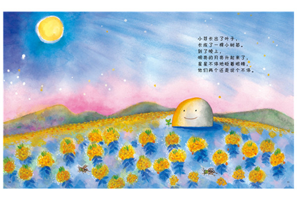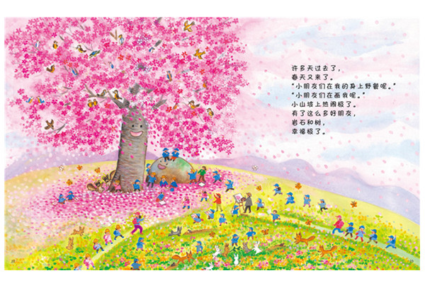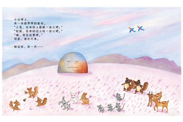 小山坡上,有一块孤零零的岩石。“小鸟,在我的上面歇一会儿吧。”“松鼠,在我的边上玩一会儿吧。”“嗨,我在这里呢。”可是,谁也不来。有一天,一颗小红果子滚到了岩石的边上。他们俩成为了*好的朋友。春去秋来,岩石的脚边长出了一棵小树苗,又飞来了几只小鸟。岩石的好朋友,越来越多。